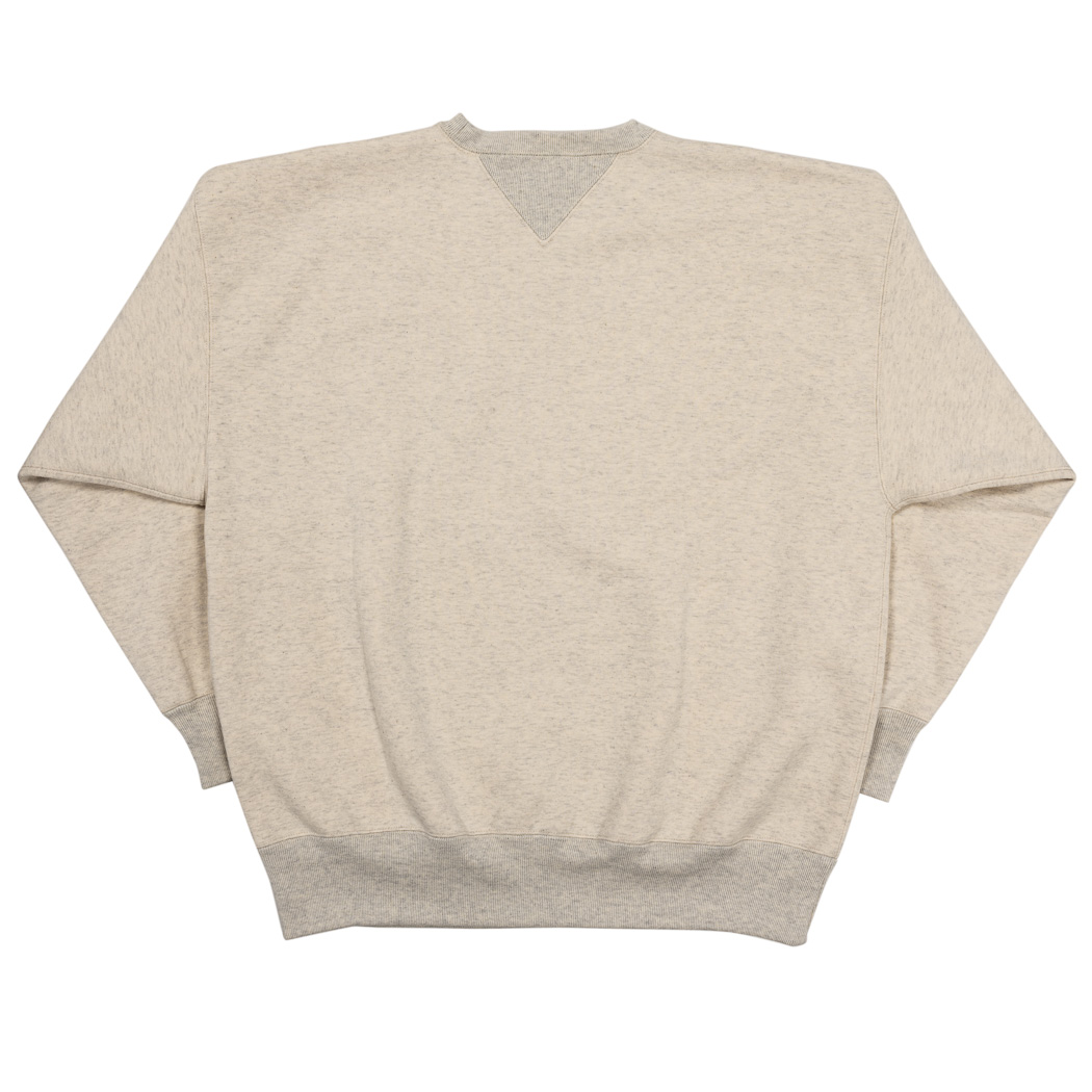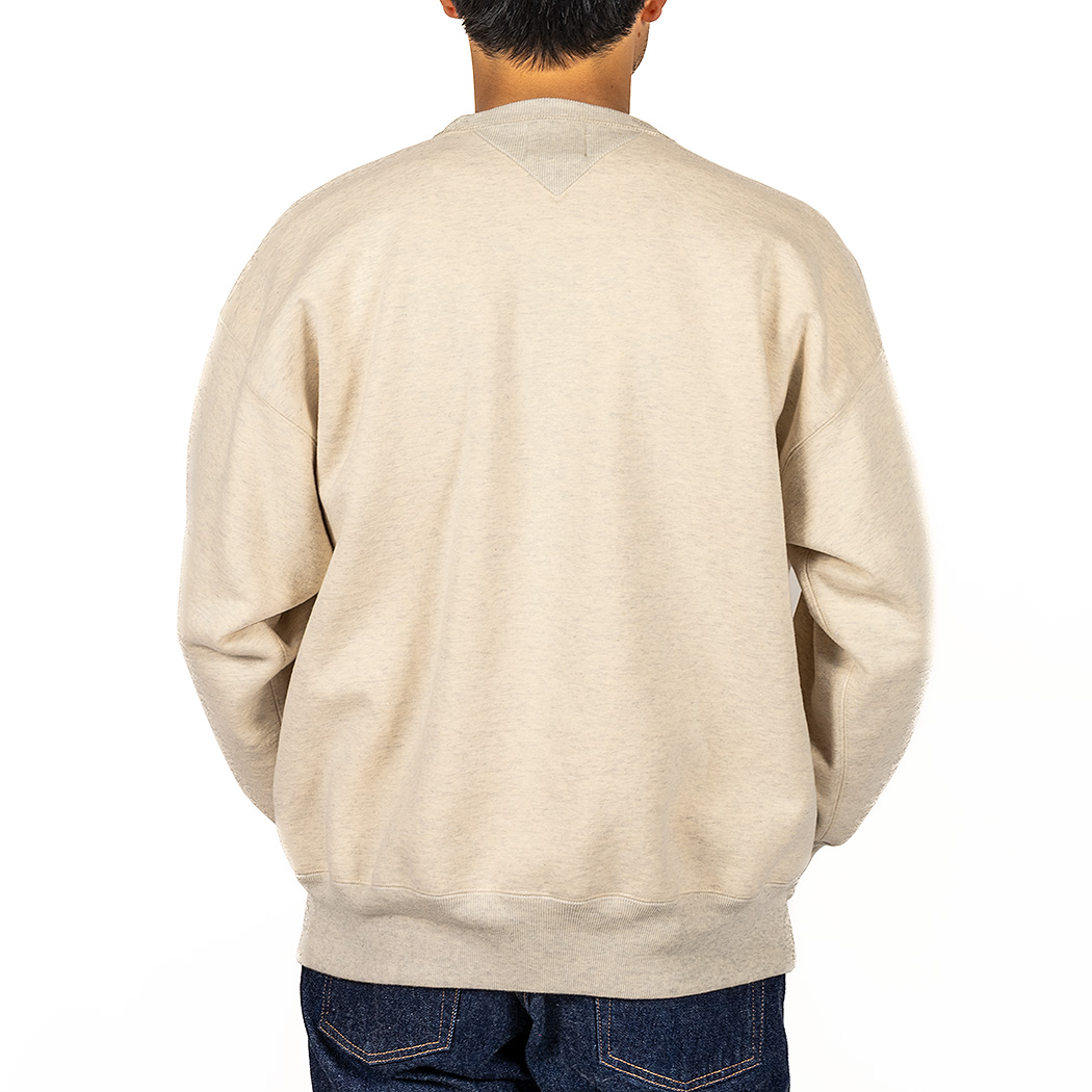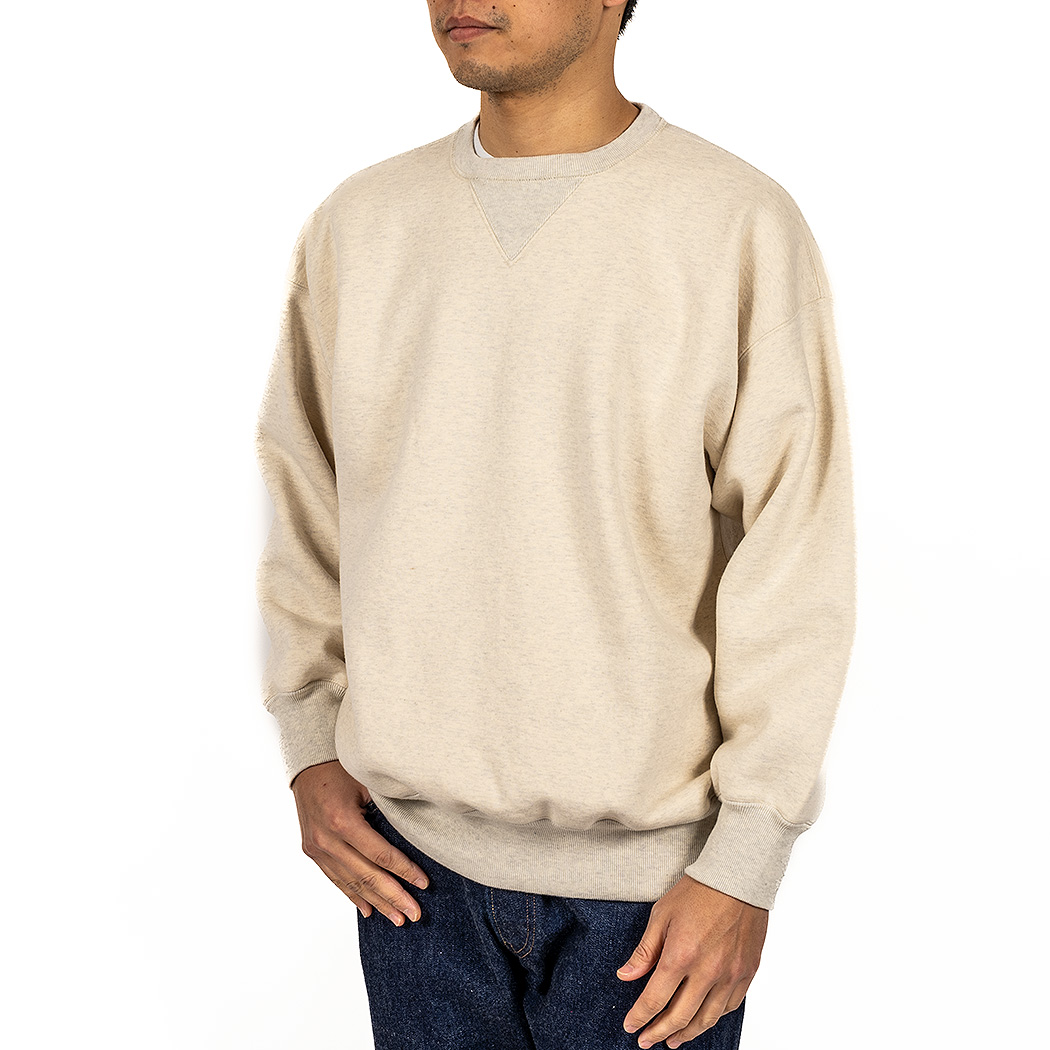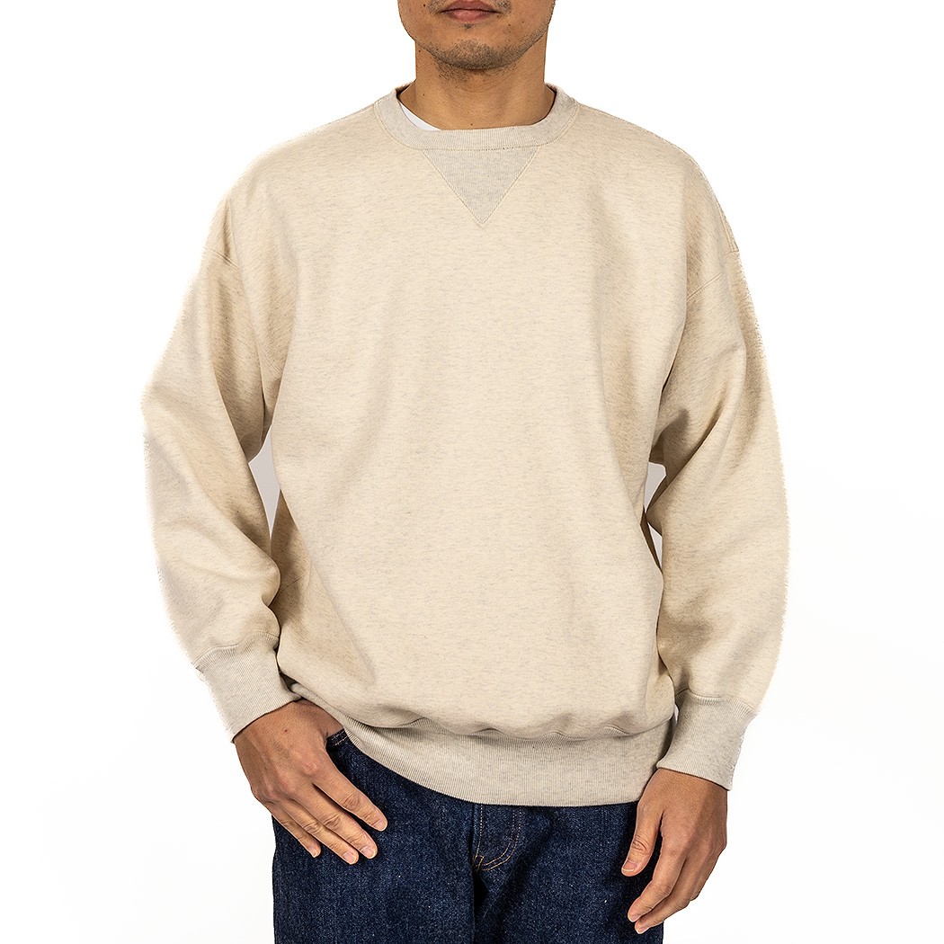 表30 番・中30 番・裏7 番で、裏の糸ループを短く編み、 さらに起毛をかけた本格的冬用スウェットです。18ゲージでガチガチに目を詰めて編んでいるので形崩れしにくい。重さ15 オンス程あり、いわゆる「超ヘビーウェイトスウェット」 でも化繊は使っていないのでしなやか。