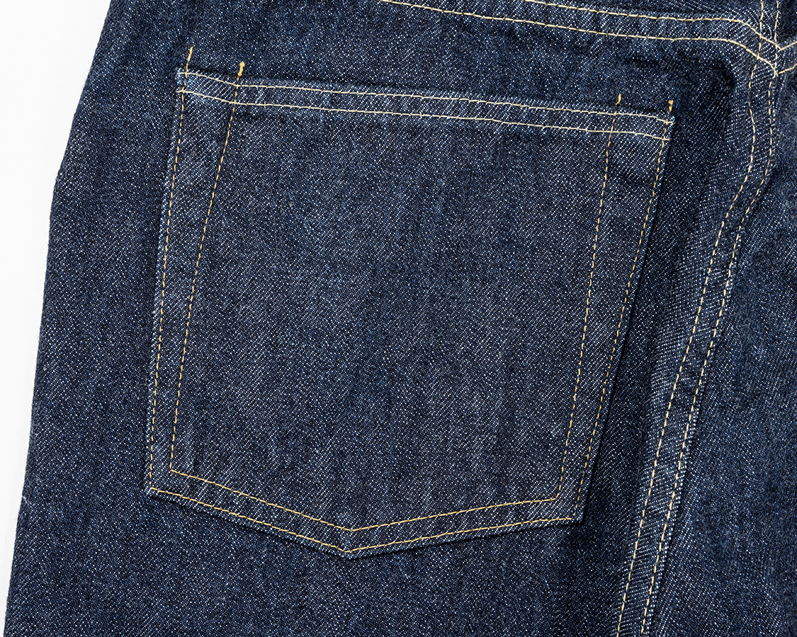 バックポケット。取り付けの上端が妙に幅広なのが大戦の特徴で、縫製した人の技術が稚拙で隠しリベットをよける時に、よけ過ぎたとか言われています。