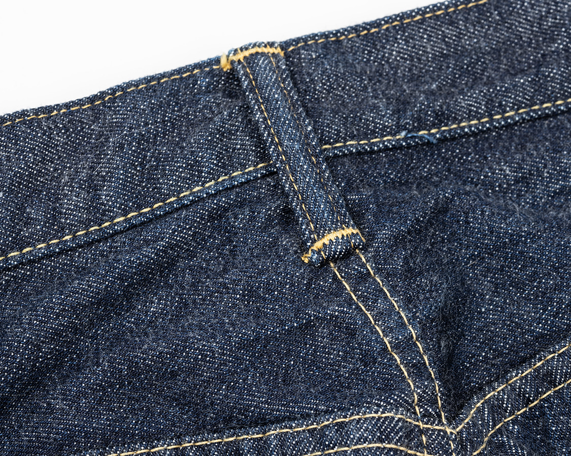 ベルトループ、真ん中が盛り上がった金具を使っています。本来は、ラッパに生地幅が微妙に広い裁断生地を突っ込んだので、真ん中が盛り上がって「しまった」のだと思いますが、それをわざわざ仕様として再現するのが「にっぽんのジーンズ」。