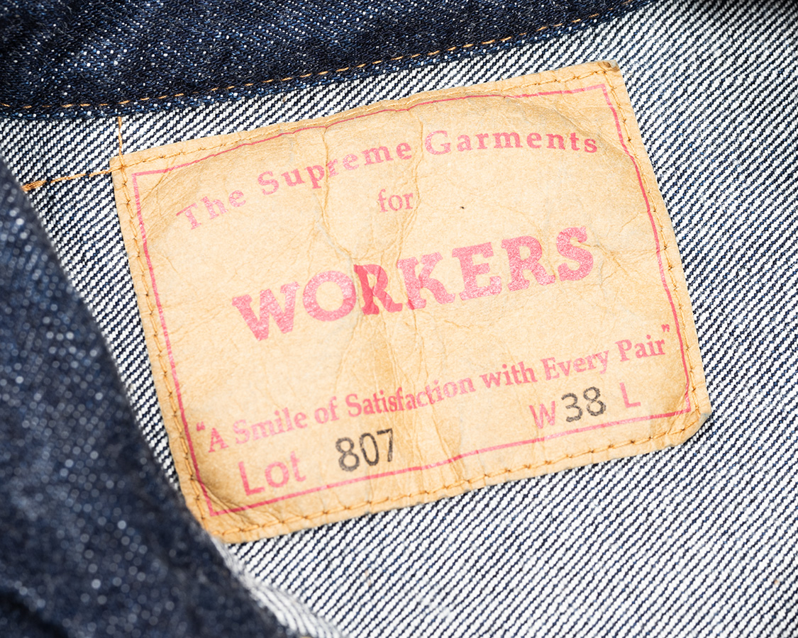 フラップ、表・裏に縮率があるので端がくるっと丸まります。現代なら絶対にNGな部分にも良さを感じるのが「レプリカジーンズ」的な製品の面白いところ。 |