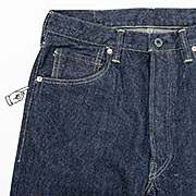 ボタン、トップは月桂樹で中にS字のカンが入っている物。その下は、以前、No.2デニム風で作ったWORKERSのロゴ入り。このメッキを合わせたくてわざわざ月桂樹も別注で作りました。対戦の「なんでもあり」仕様を取り入れ、結果それがカッコいい!となる部分です。 定番801より「生地が厚い」「シルエットが太い」。細かなディテールは完全に自分の趣味で、単純に「もう少しワイドストレートでタフな印象のジーンズを作りたい」と思い形にしてみました。