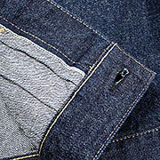完成した糸をロープ染色。下染め・後染め無しのピュアインディゴ染色。今回、比較的赤みが少なく青みが強く出ているのが色の特徴。 さらに、織布はミミ付の力織機。ローテンションで織ることで、ふっくらとした風合いになり、糸、さらには綿本来が持つキャラクターを消さないようにしています。完成した生地は防縮加工や毛羽を取り去る毛焼きは行わないキバタデニム。洗うと縮みねじれるのが特徴。