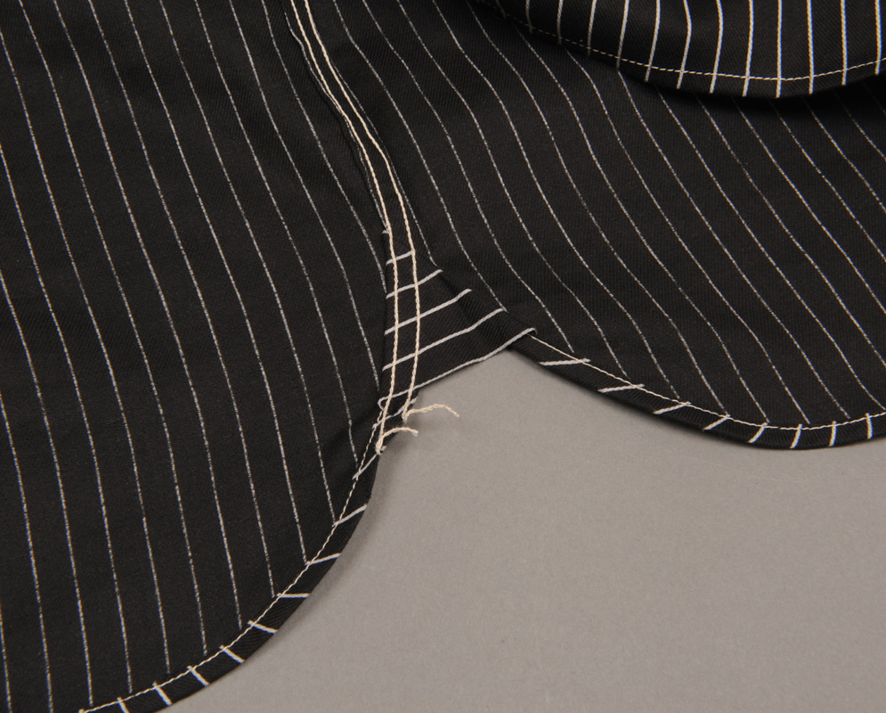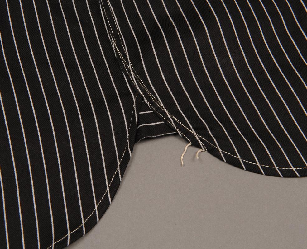 今回、脇・肩・そでぐりなどに使った巻き縫いミシンはすべて3/16インチという、前回ワークシャツに使った1/4インチミシンよりも細い針幅のものを使用しています。