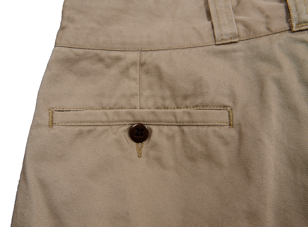 後ろポケットは一見玉ぶちのようですが、パイピング状に細い生地でポケット口を巻き込んで始末しています。