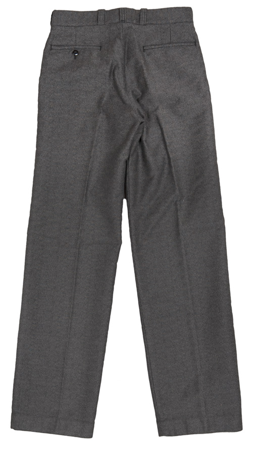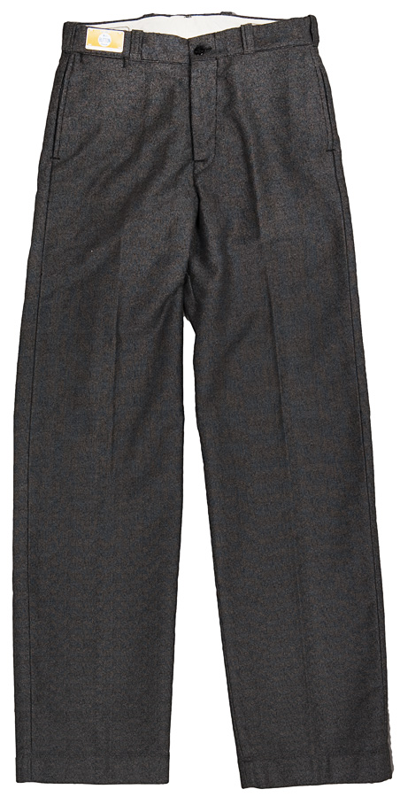 Stifel社のモールスキンを参考に組織を調べ、生の生地から作り、染め、銅のシリンダープリントで柄を抜染したオリジナル生地を使ったトラウザーズです。