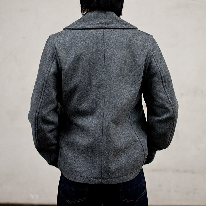 プリズナーコート、バストからウェストをわずかに絞ってから裾に向い、今度は若干Aラインを描くように広げています。