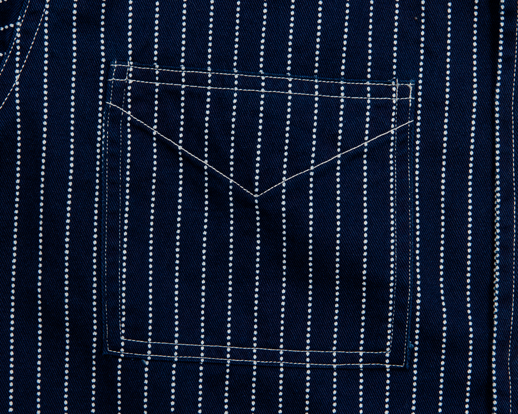 右胸ポケットは大き目のスクエア型。ポケット口には、表地と同じ生地を裏に当ててV字のステッチでたたいています。