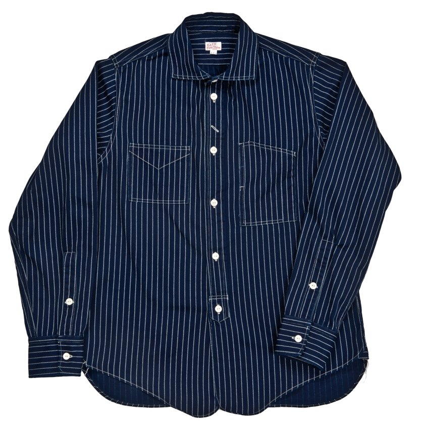 襟を開き気味かつ、角型にし、Reliance型などのワークシャツとの違いを強調しています。台襟はあえてチンストラップを無くし、組み合わせやすい一枚にしています。