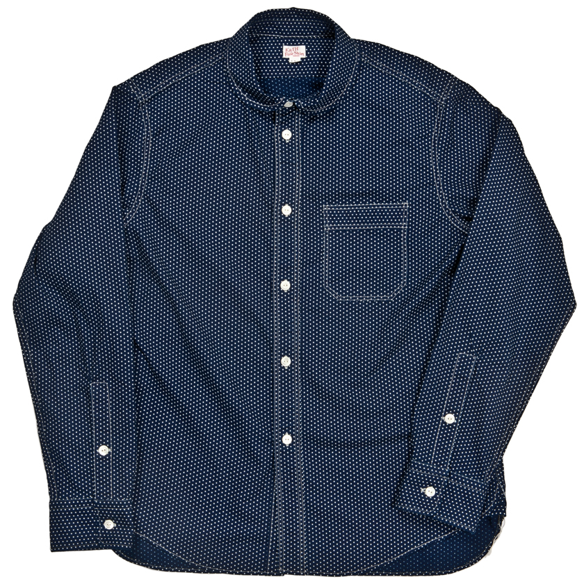 1枚はこのポルカドットでシンプルなデザインで、クラシカルなワークシャツが欲しいという思いからこの1枚を企画しました。