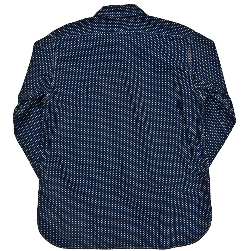 着る時を選ばない、シンプルな形のワークシャツで、ポルカドットの色変化を楽しめるシャツです。洗い済みの製品をお送りいたします。