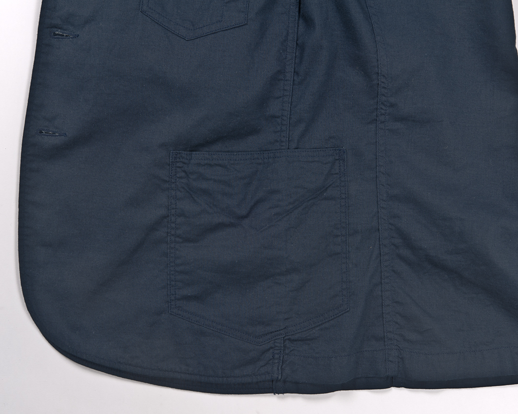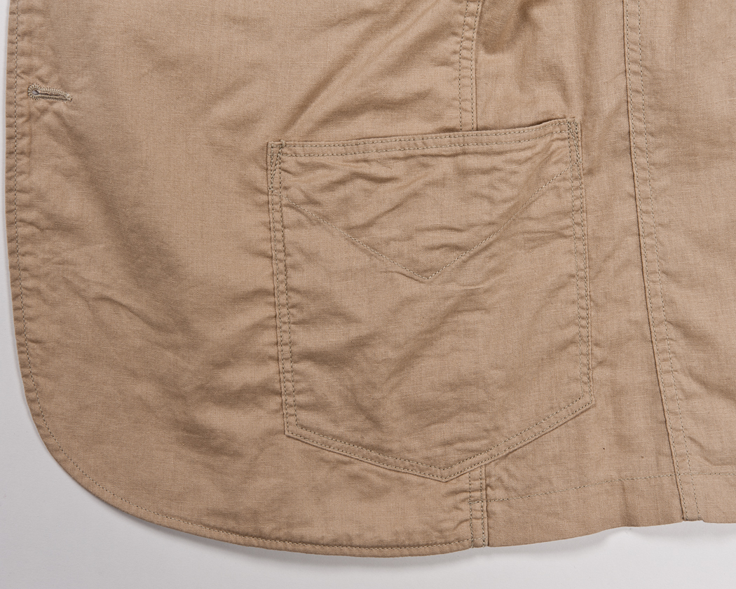 先に、脇を巻き縫いしてから脇ステッチを貫通してたたきつけています。フロントには見返しがあり、さらに間には薄い接着の無い芯が入っています。 微妙な縮率差も影響して、立体的なポケットになっています。