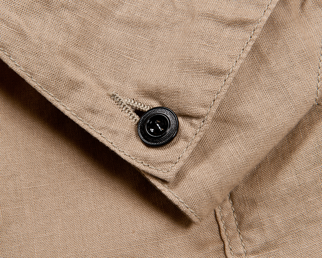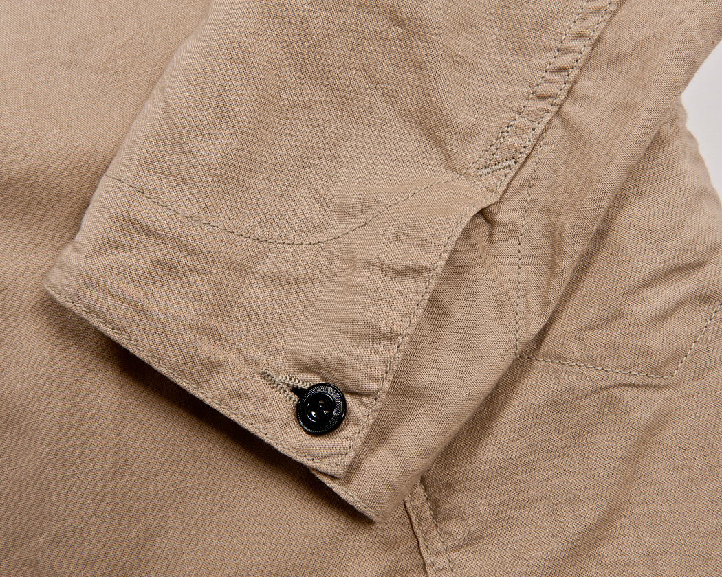 今回、三巻にして袖を直しやすく始末する事も考えましたが、おおもとのレイルロードジャケットの袖周りのステッチ・作りを残したかった事。そして、春夏と言う事もあり、袖を少しまくったりと着こなしでの遊びも考えて、ボタン止めにしました。