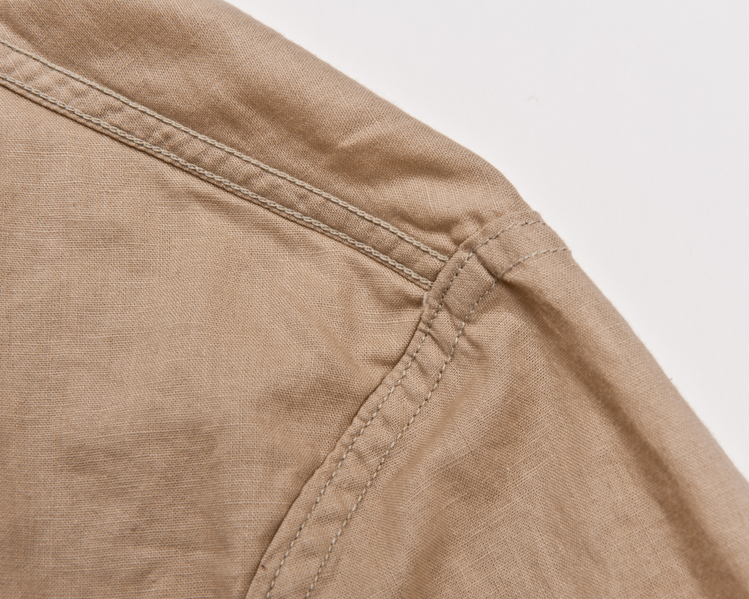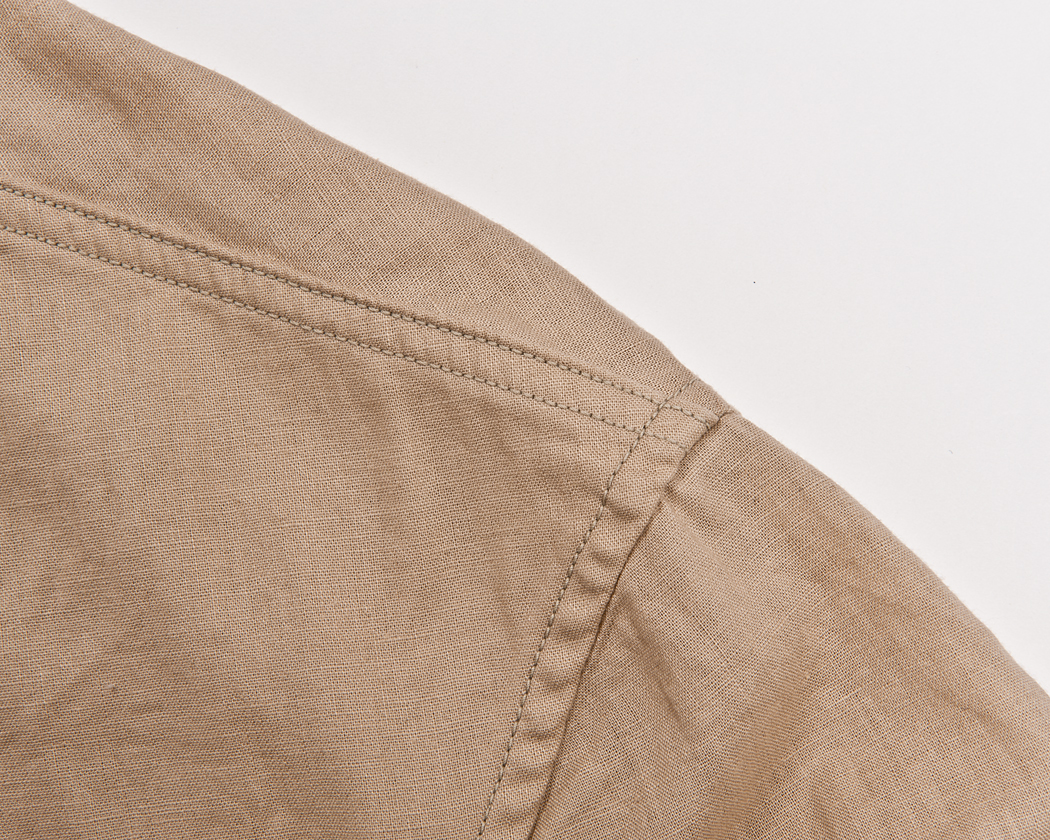 ボタンダウンの袖ぐり伏せ縫い同様、寸法差からでる皺もこの製品「らしさ」を強調しています。