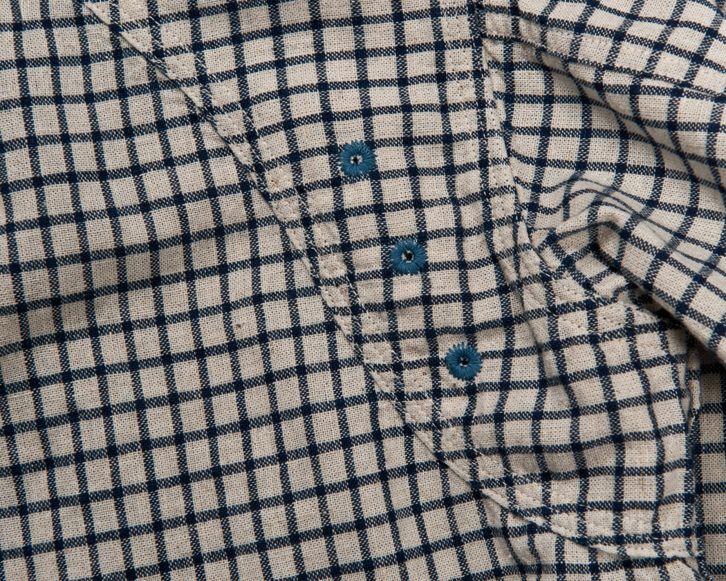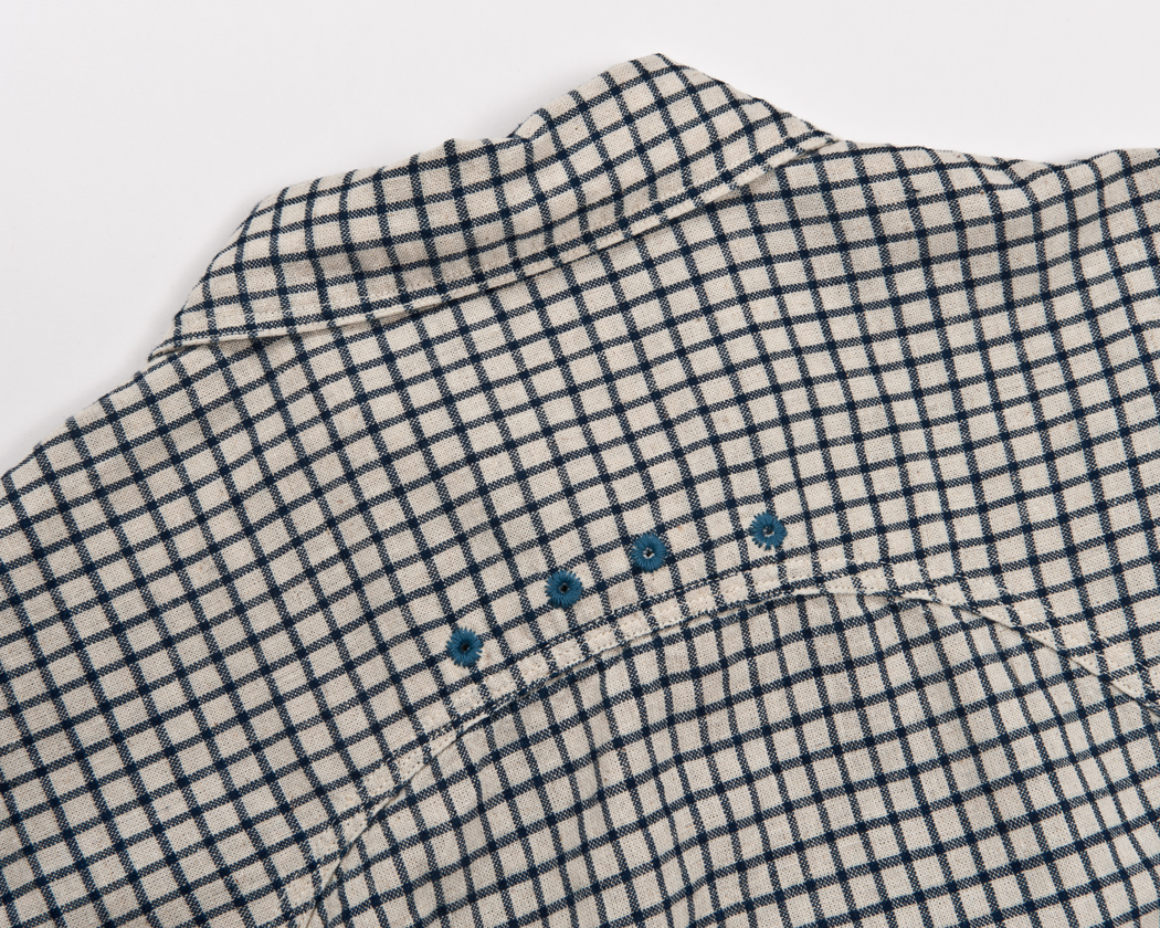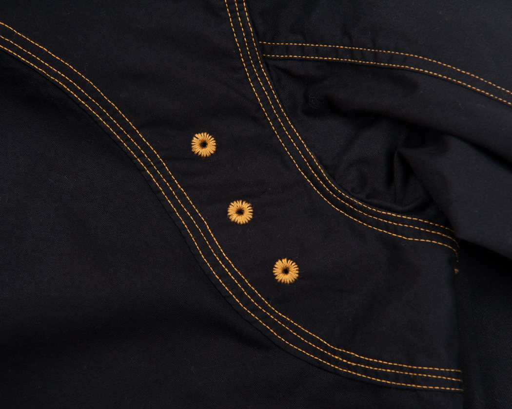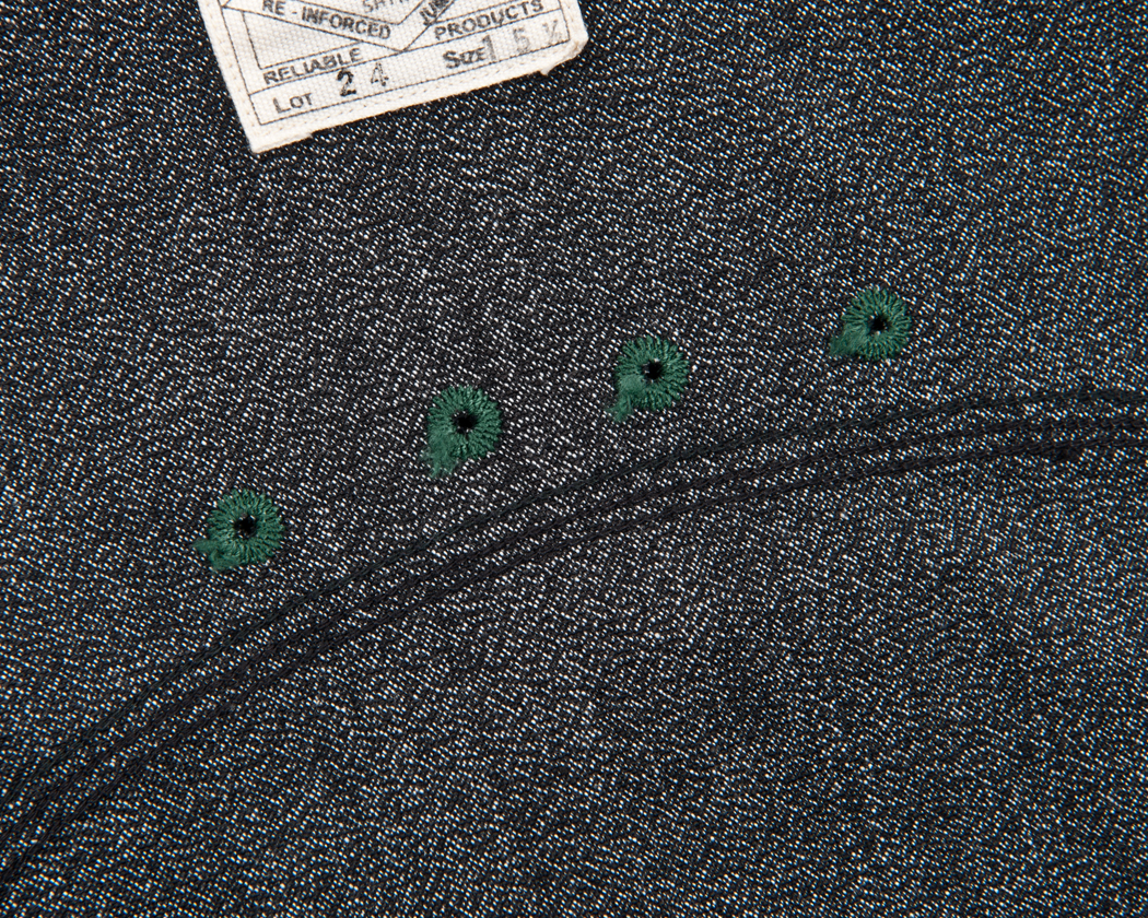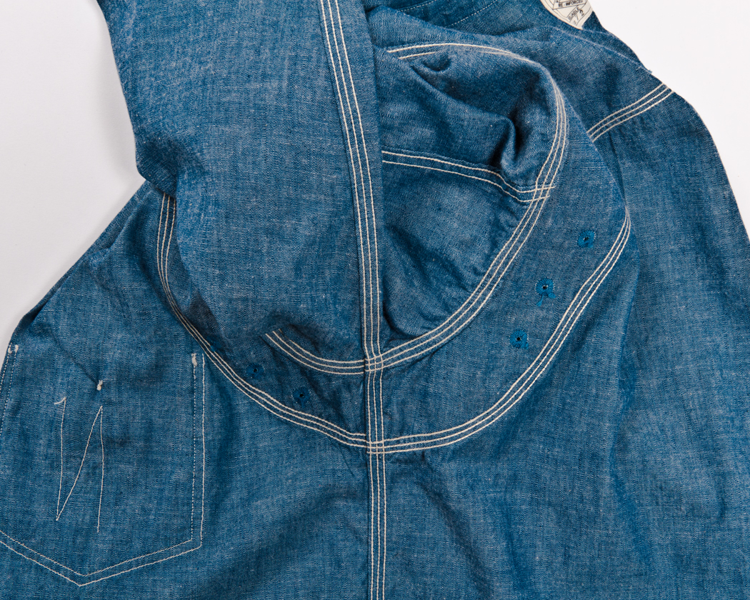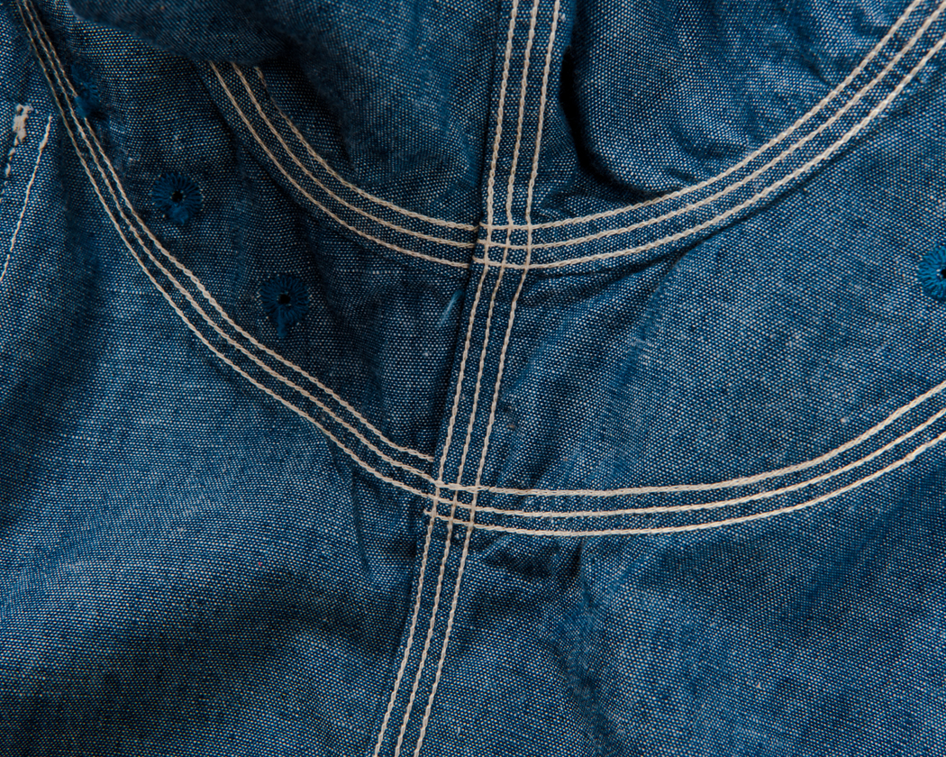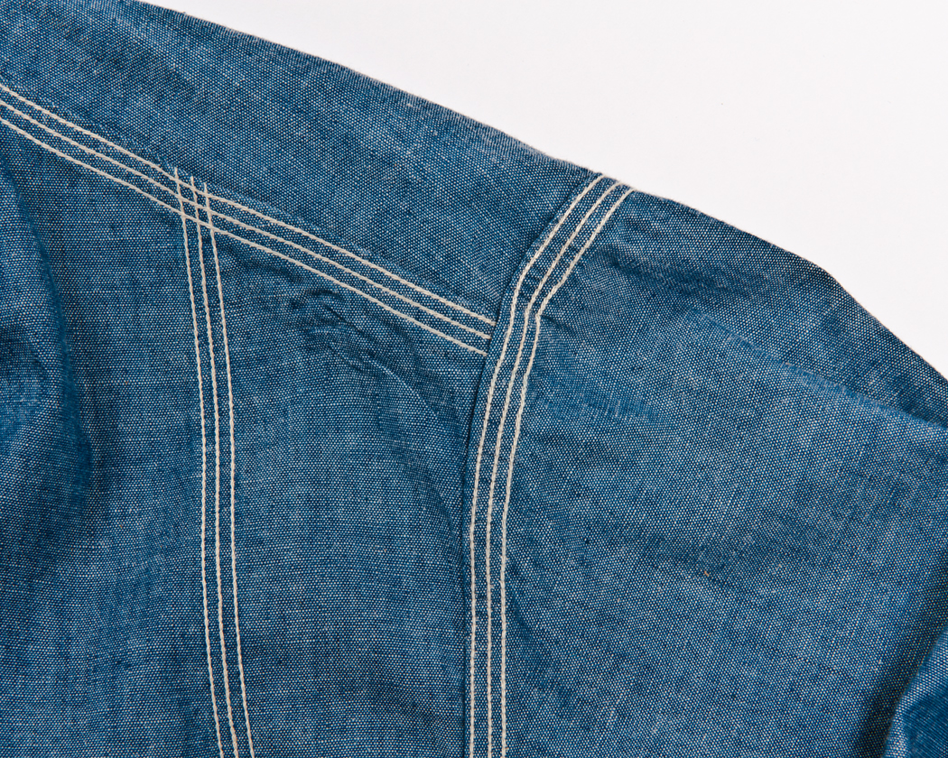 ヨークはトリプルのチェーンステッチで縫うのですが、Lot30だけは3回別々に1本針チェーンステッチで縫っています。生地の織りがしっかりしているので、伸びが好くなく、3本チェーンで縫うとどうしても生地にタックができてしまうからです。なので、若干ステッチがよたっています。