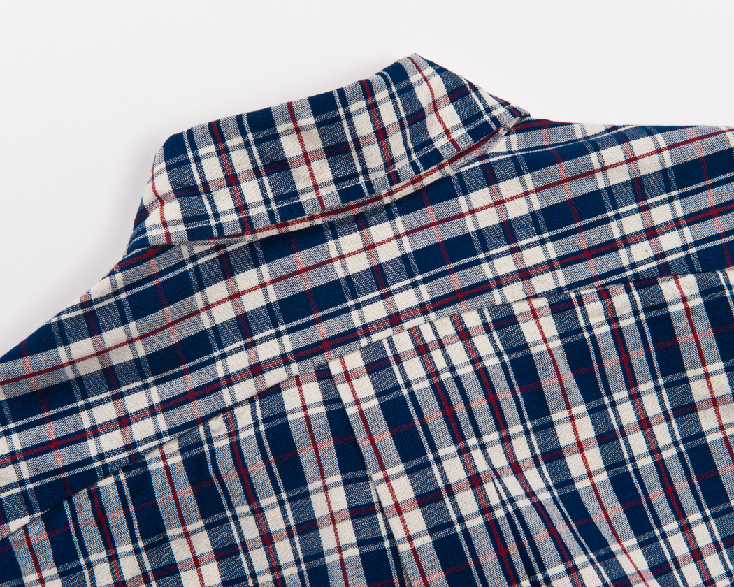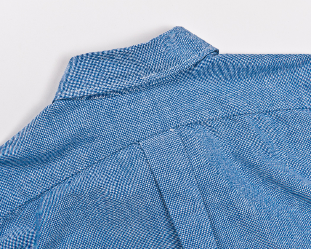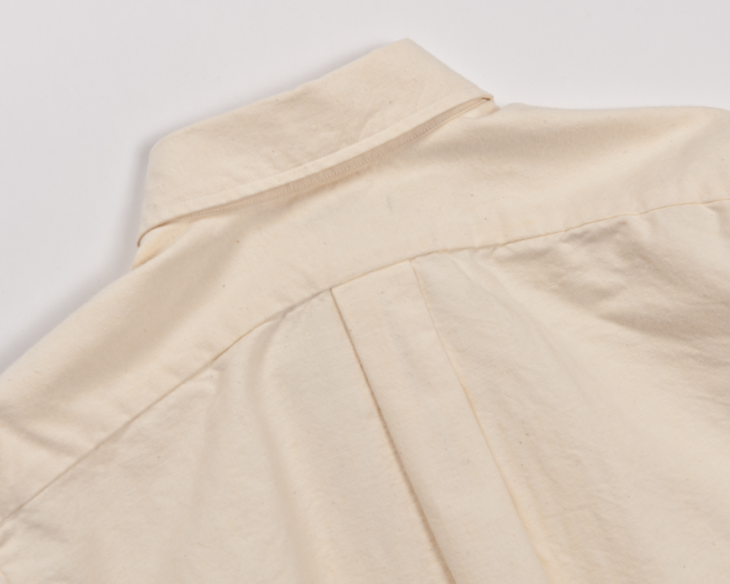 今回のLot20, Hidden BDでもあえてこのタックは残しました。フロントの始末が独特で、左右から強いテンションをかけたくありません。そこで、若干ゆったりシルエットには成りますが、バックタックは残す。一方で、肩幅はワークシャツなどよりは小さく。これは、ワークシャツの動きやすさよりは、ドレスシャツ的な立ち姿の美しさを目指しているからです。ワークシャツの若干落ち気味の肩、あれはあれでかっこいいのですが。