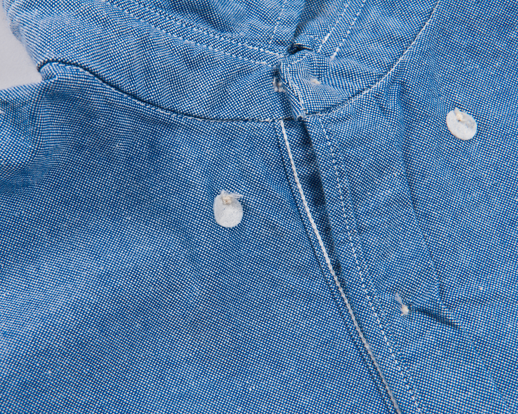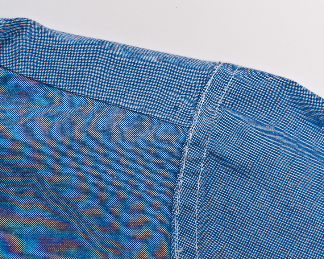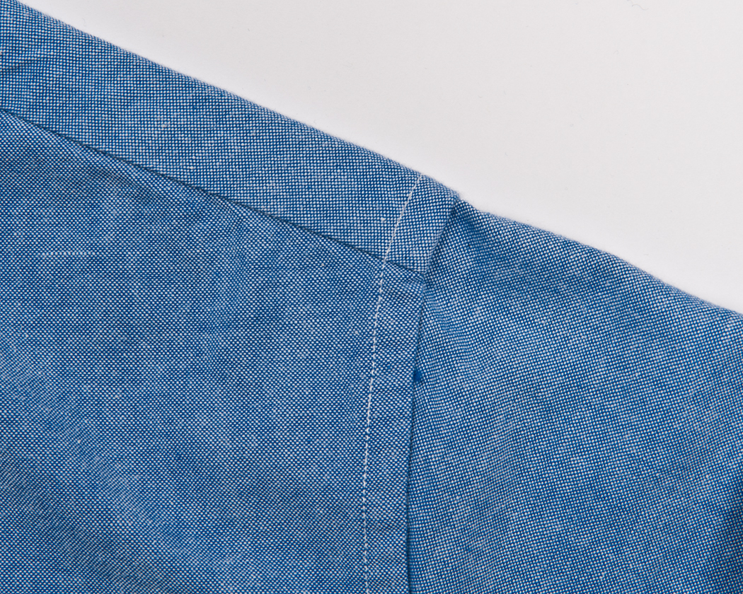 袖ぐりの折り伏せ縫い。3回別々に縫っています。やはり、BDシャツに似つかわしいのはこの太めの伏せ縫いです。
