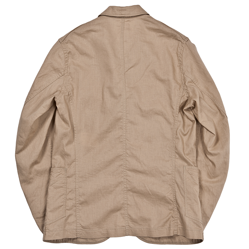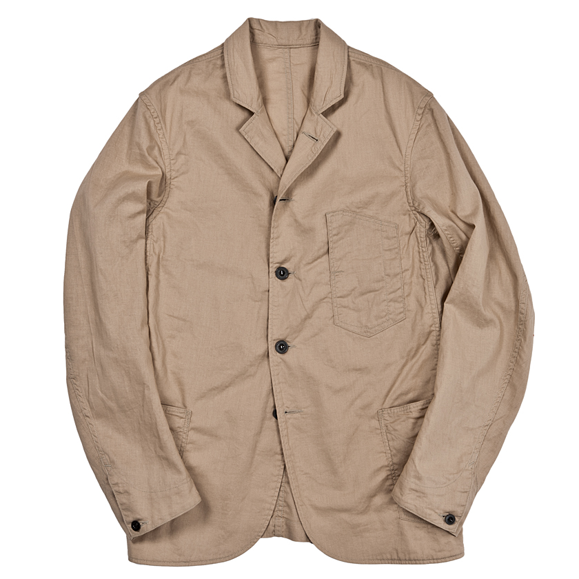 単なるジャケットではつまらないので、デザインはレイルロードジャケットを取り入れ、素材は綿・麻を繊維の段階で混ぜ、糸にして織りあげた生地を使いました。麻独特のハリがありながら、チクチクせず、糸も自然なムラがでています。
