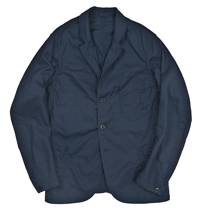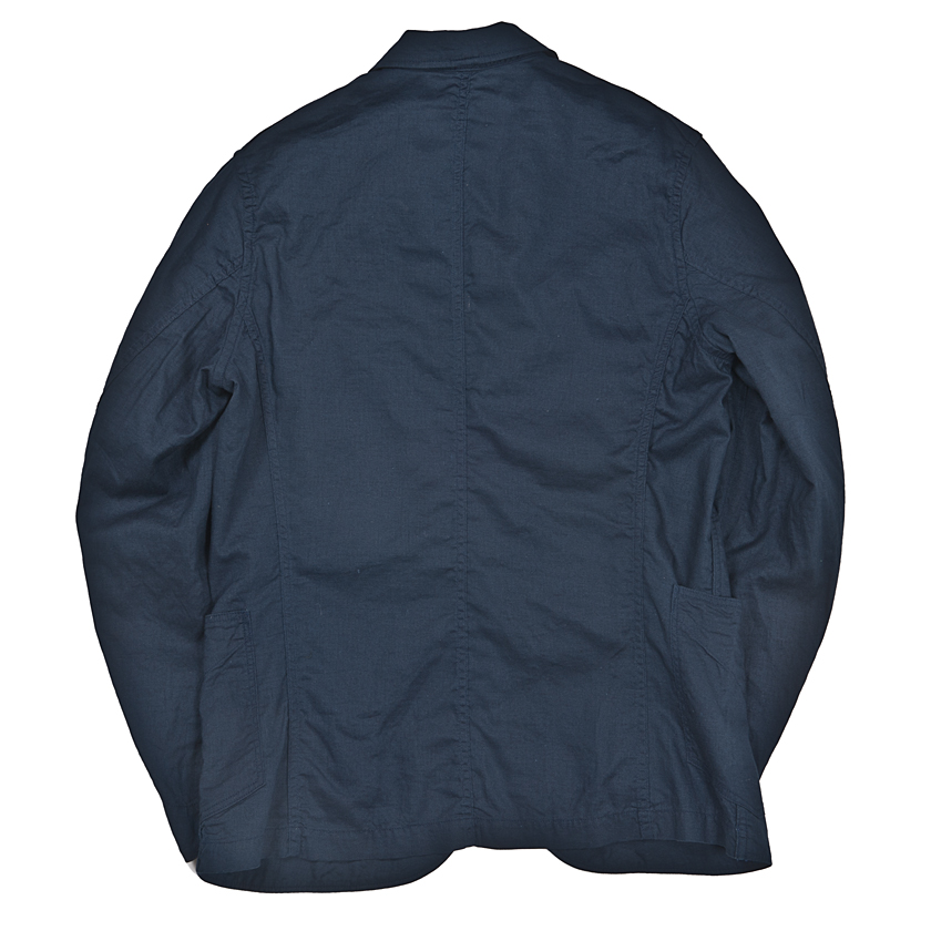 単なるジャケットではつまらないので、デザインはレイルロードジャケットを取り入れ、素材は綿・麻を繊維の段階で混ぜ、糸にして織りあげた生地を使いました。麻独特のハリがありながら、チクチクせず、糸も自然なムラがでています。