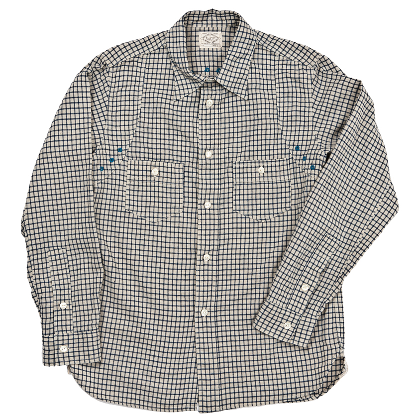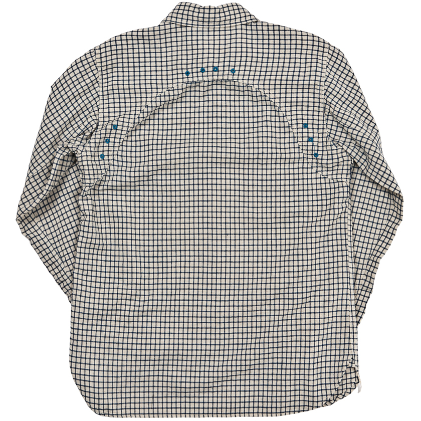チンストラップ付きの台襟、太めの巻き縫い(1/4インチ)、やはり太めの前立て(4.2センチ幅で1/4インチステッチ)。 四角い剣ボロに2ピースの袖と、クラシカルなワークシャツの仕様を盛り込んでいます。