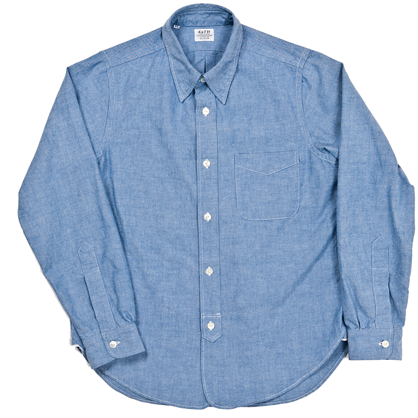 SUNSETのワークシャツ に見られる隠しボタンダウンとクラシックなドレスシャツ の重なりがありラウンドした始末を組み合わせ、ベーシックなオックスフォードで仕立てています。