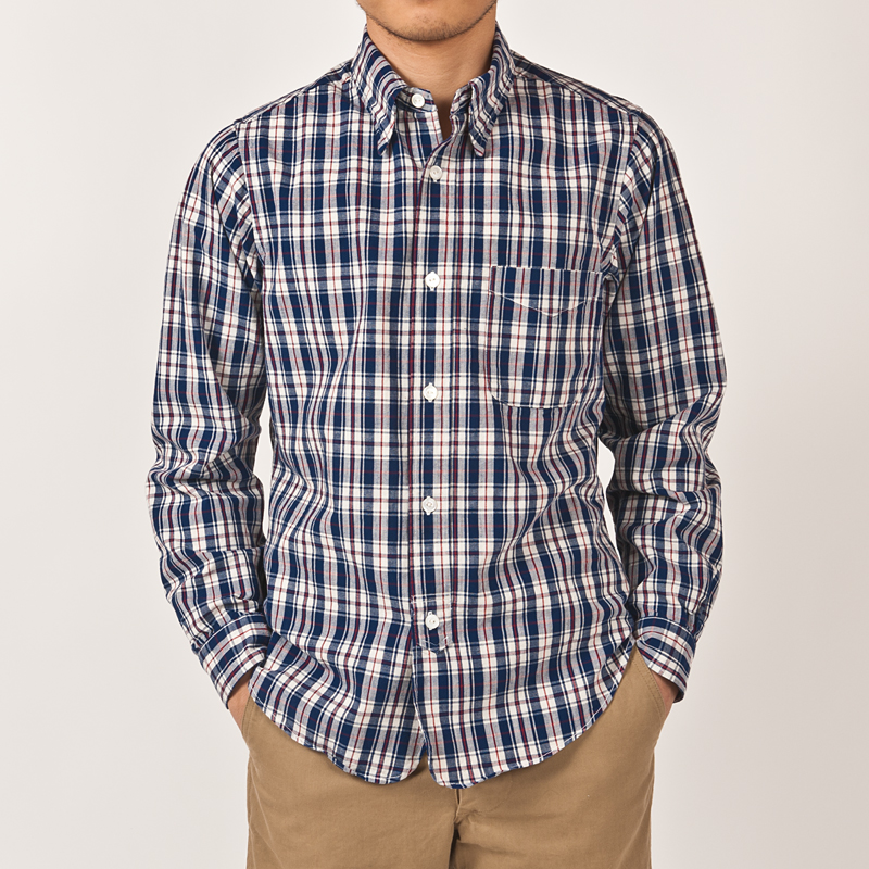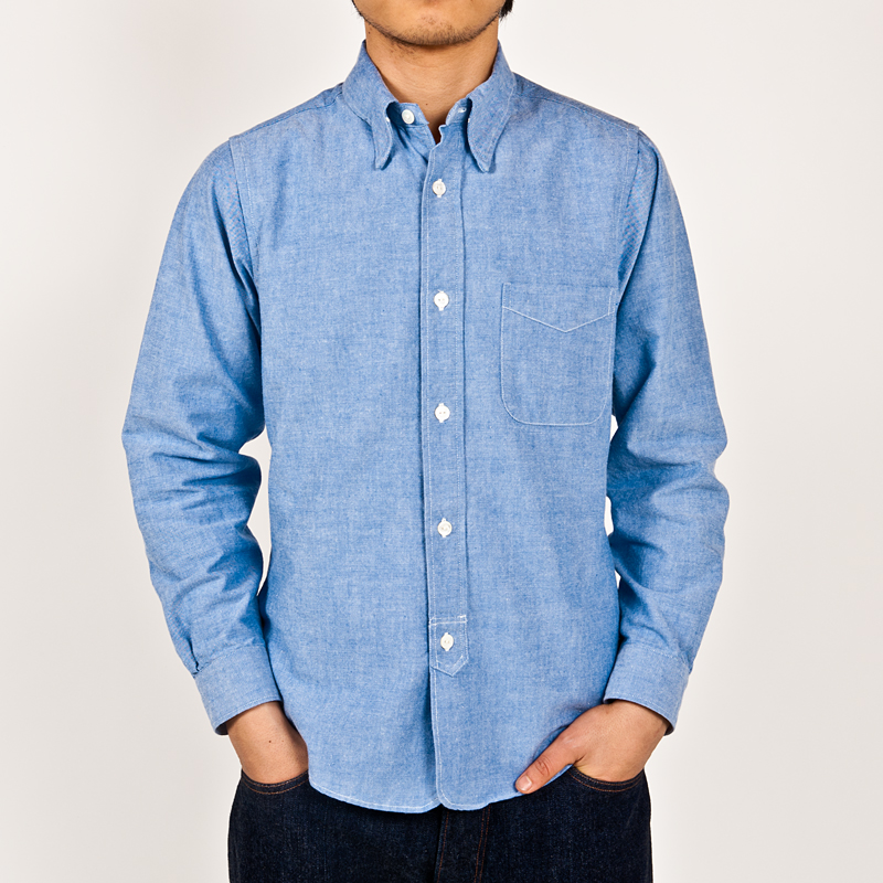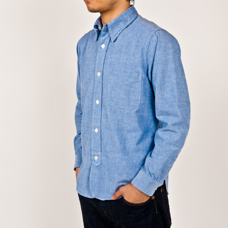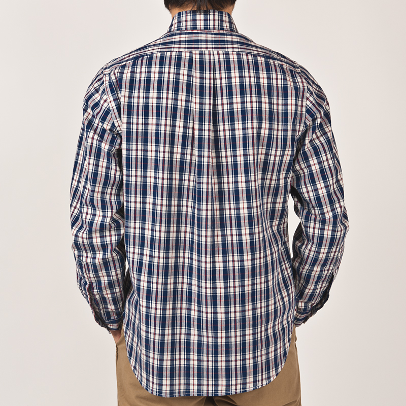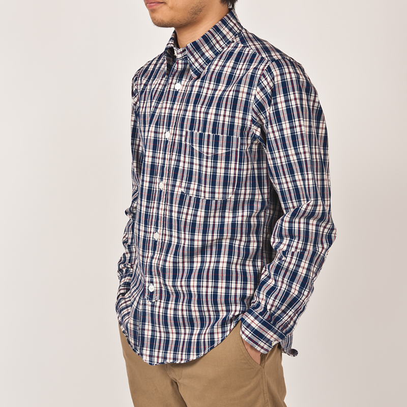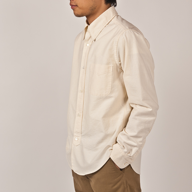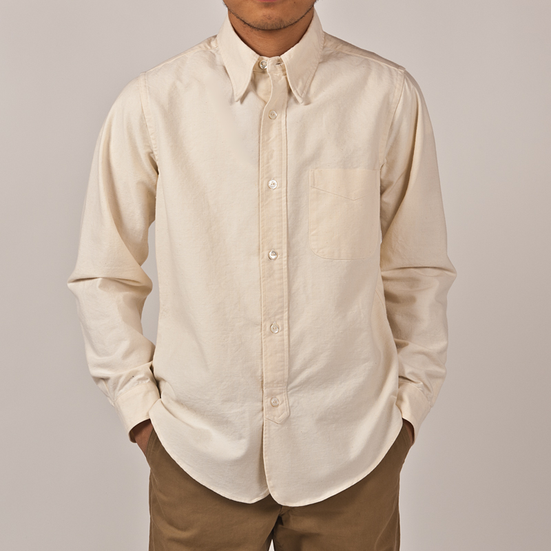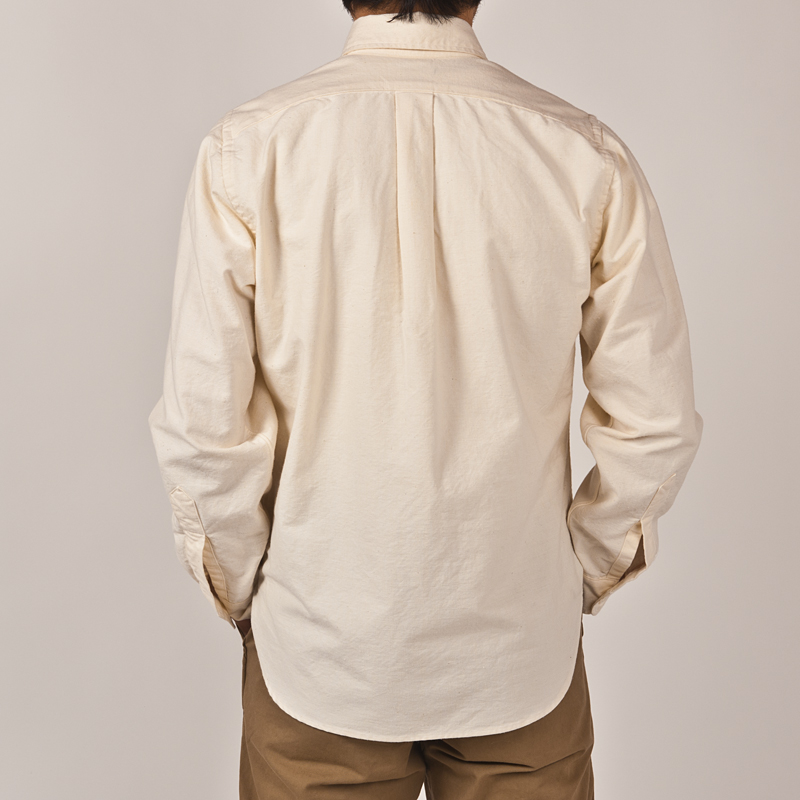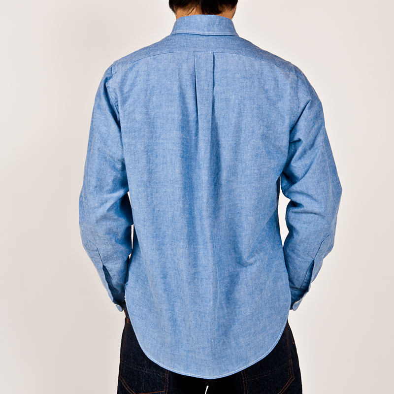 また、肩幅がワークシャツよりは狭く、落ちていません。シャツであまりタイトすぎる物は作らないのですが、やはりドレスシャツの雰囲気を残すものと、ワークシャツでは印象を変えたいものです。そこで、肩幅は小さめに、しかし身頃はタックを入れてゆったり目というシルエットにしています。