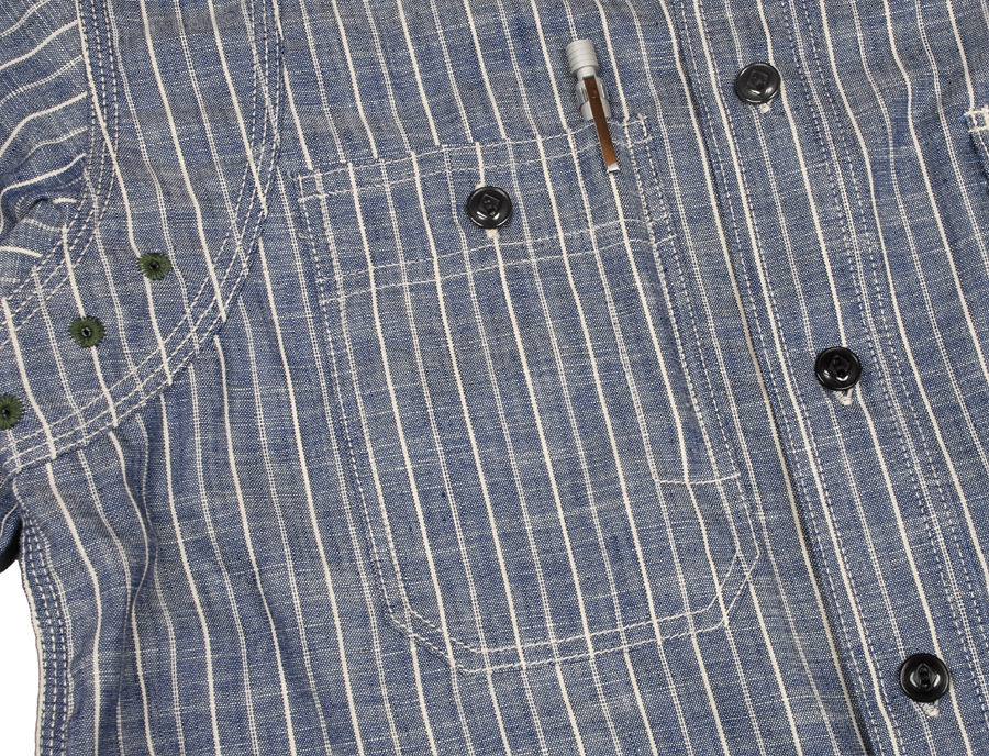 左胸ポケットは縦長の6角形。サイズの小さいシャツは、三日月当て布の上にポケットが乗ります。